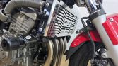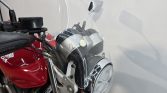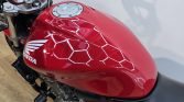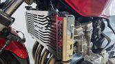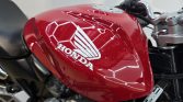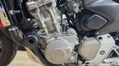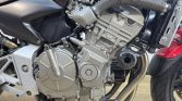 This particular CB600F comes equipped with several excellent accessories that enhance its practicality and protection. It features a clear screen for better wind deflection and highway comfort, along with hand guards to protect the rider from wind and debris. The engine and chassis are well-protected by a radiator guard and robust crash bungs. For passenger security or manoeuvring, a sturdy grab handle is fitted, and a hugger helps keep the rear suspension and underbody clean.