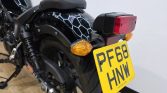 This particular Rebel comes with desirable features that enhance both safety and style. It includes robust engine bars for added protection, and the safety of ABS (Anti-lock Braking System) for confident stopping. The rider benefits from a clear and informative digital display, and a practical tinted screen that offers improved wind protection and a sportier look.