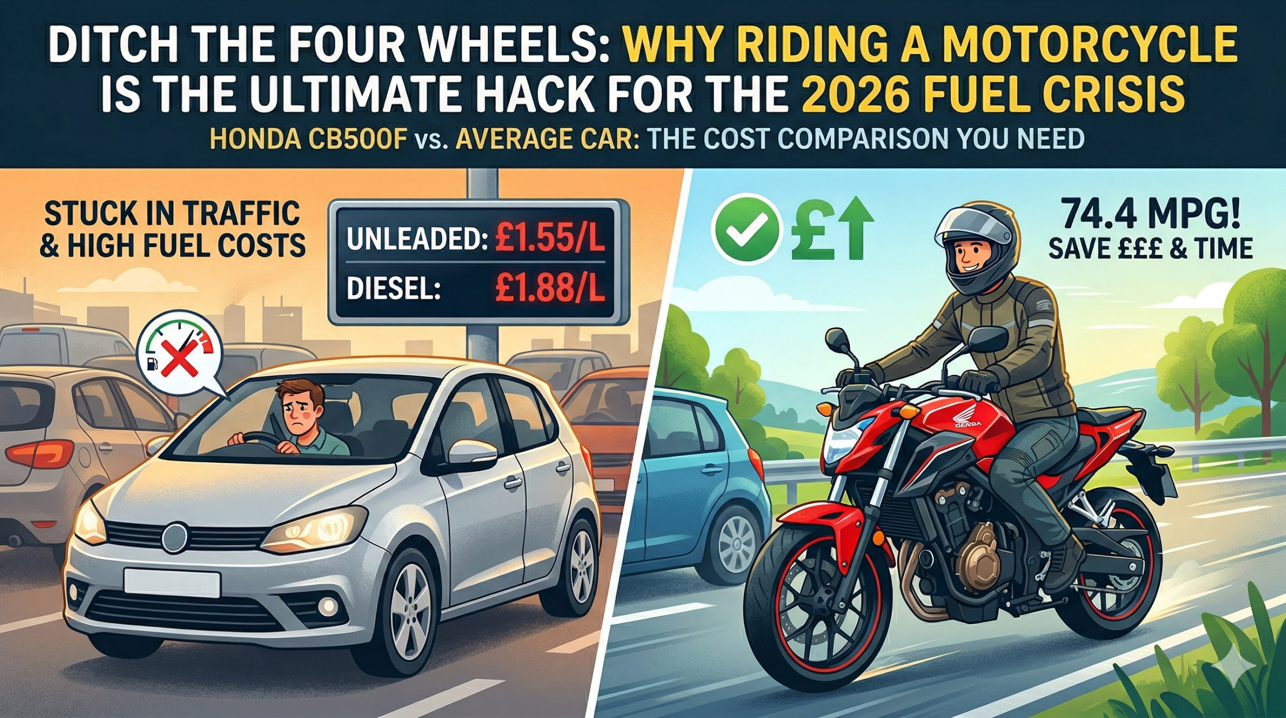 The 2026 fuel crisis has exposed the fundamental inefficiency of lugging 1.5 tonnes of metal around just to transport a single human to an office. When you stack up the incredible 74.4 MPG of the Honda CB500F against thirsty cars and the brutal £1.88-per-litre diesel prices, the motorcycle stops being just a fun hobby and becomes a razor-sharp financial strategy.