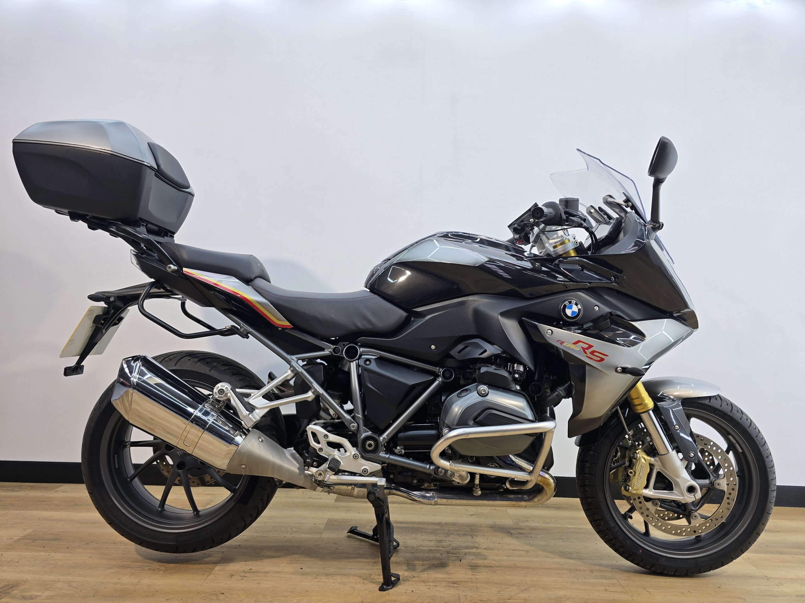 Let’s start with what sets this bike apart, because it’s simply gorgeous. The standard R1200RS was a handsome machine, but the Iconic is on another level. The paintwork is a direct homage to the original R100RS, finished in a stunning Black/Silver “Smokey Effect” metallic, bisected by bold red and orange pinstripes. The gold-anodised forks and matching gold Brembo brake callipers complete the look, creating a machine that oozes retro cool and premium quality.